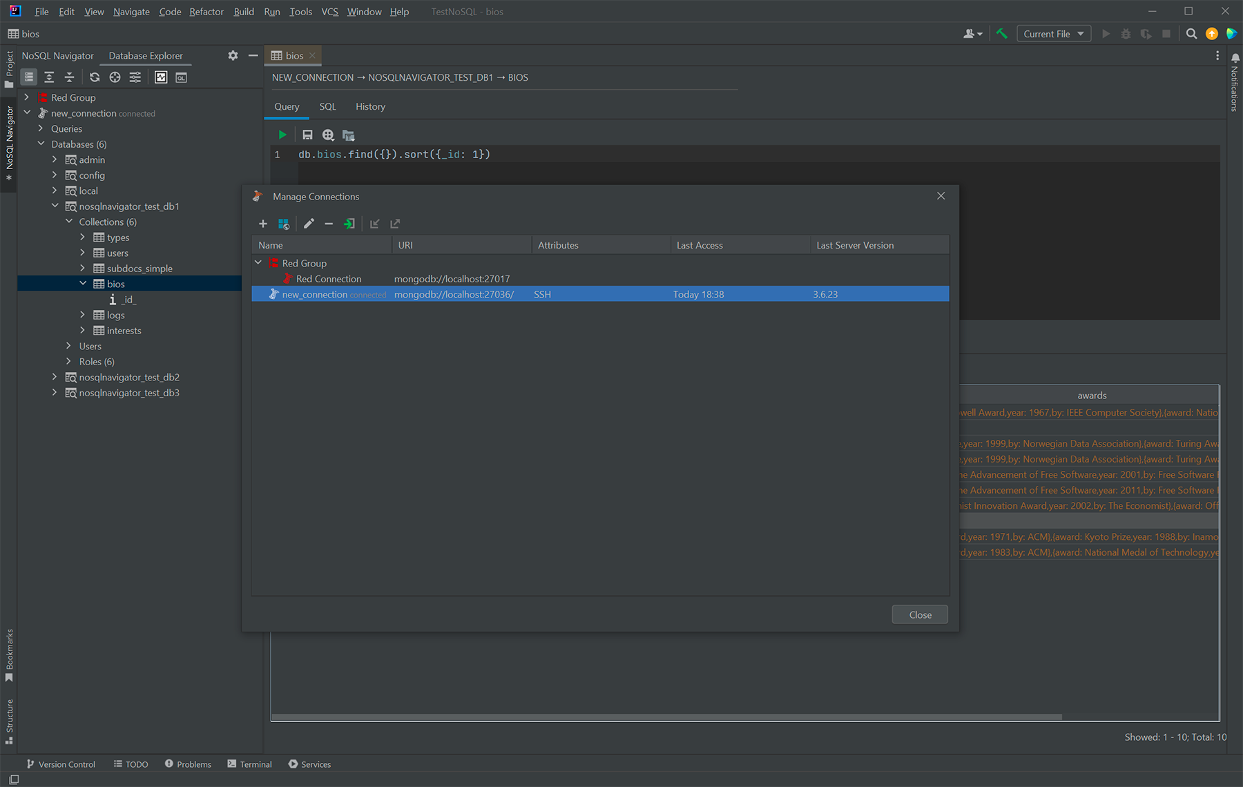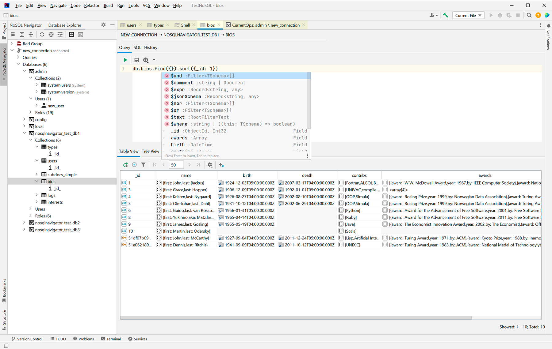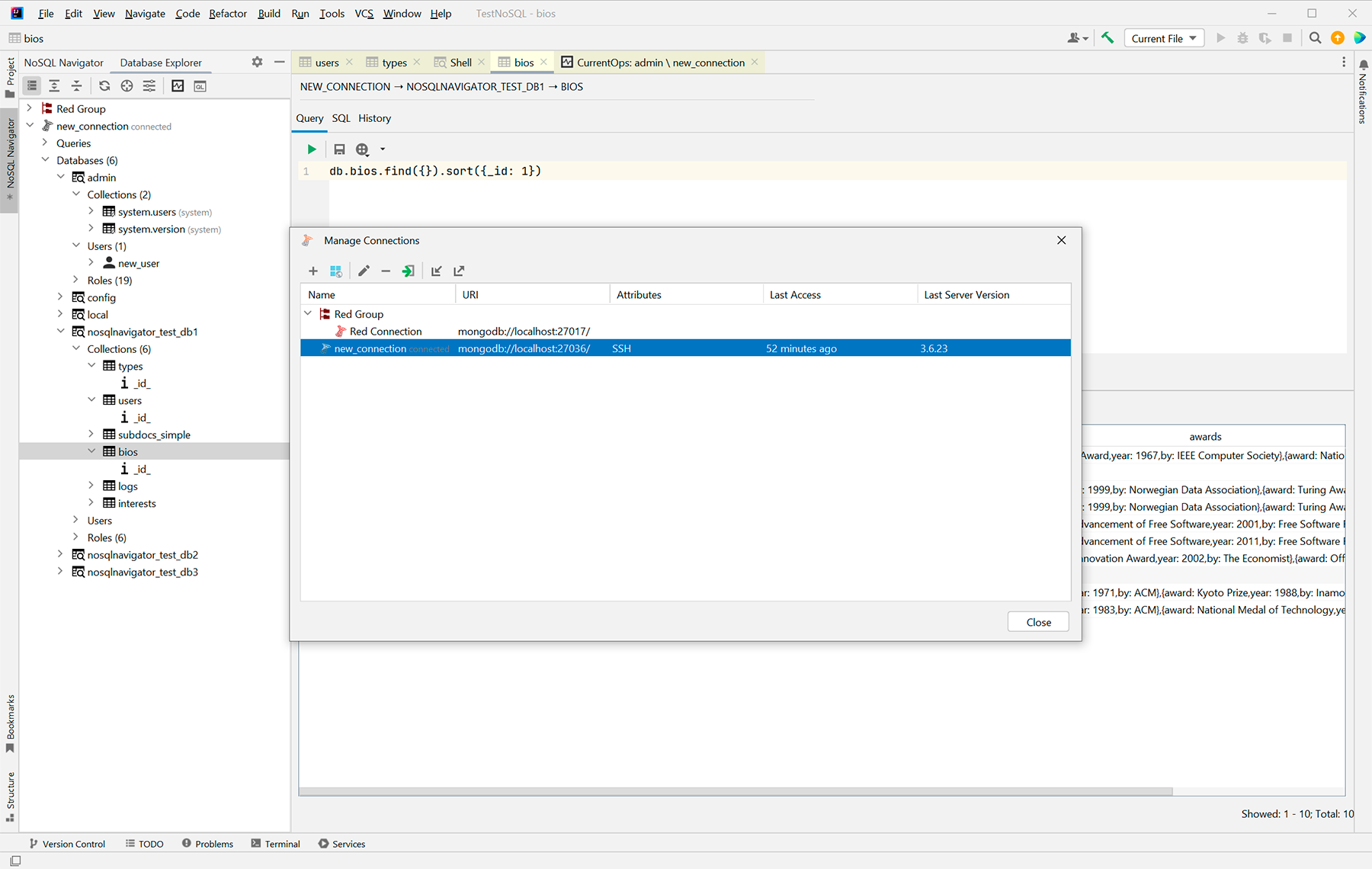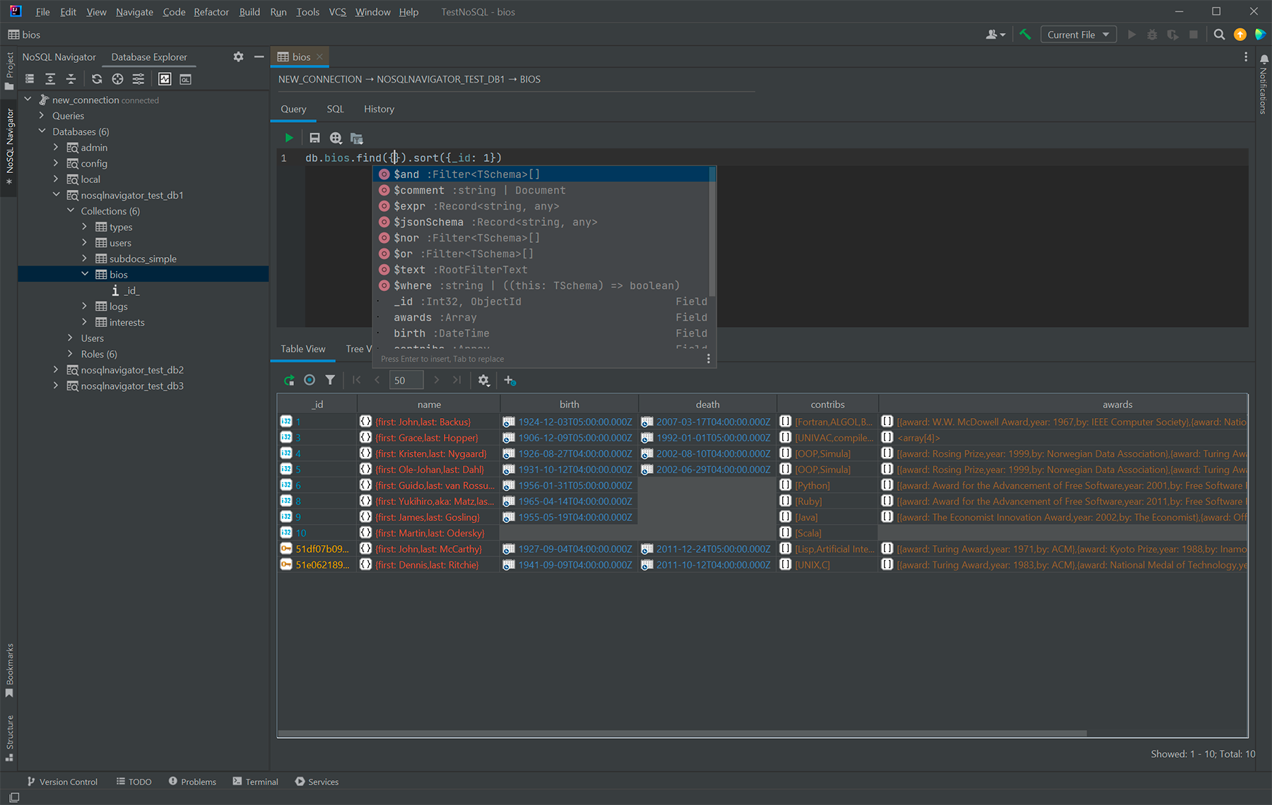 This is the official page of an advanced plugin for JetBrains IDEs. NoSQL Navigator for MongoDB accelerates your management of MongoDB with faster data exploration, query code competition, SQL to mongo query converting, and more.