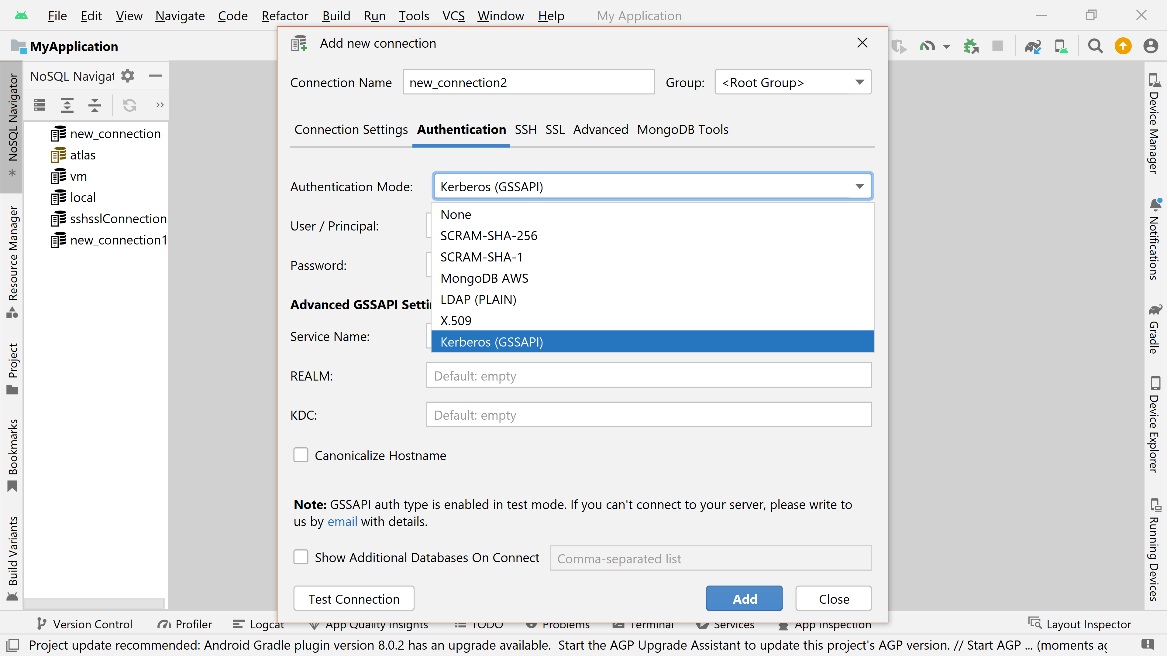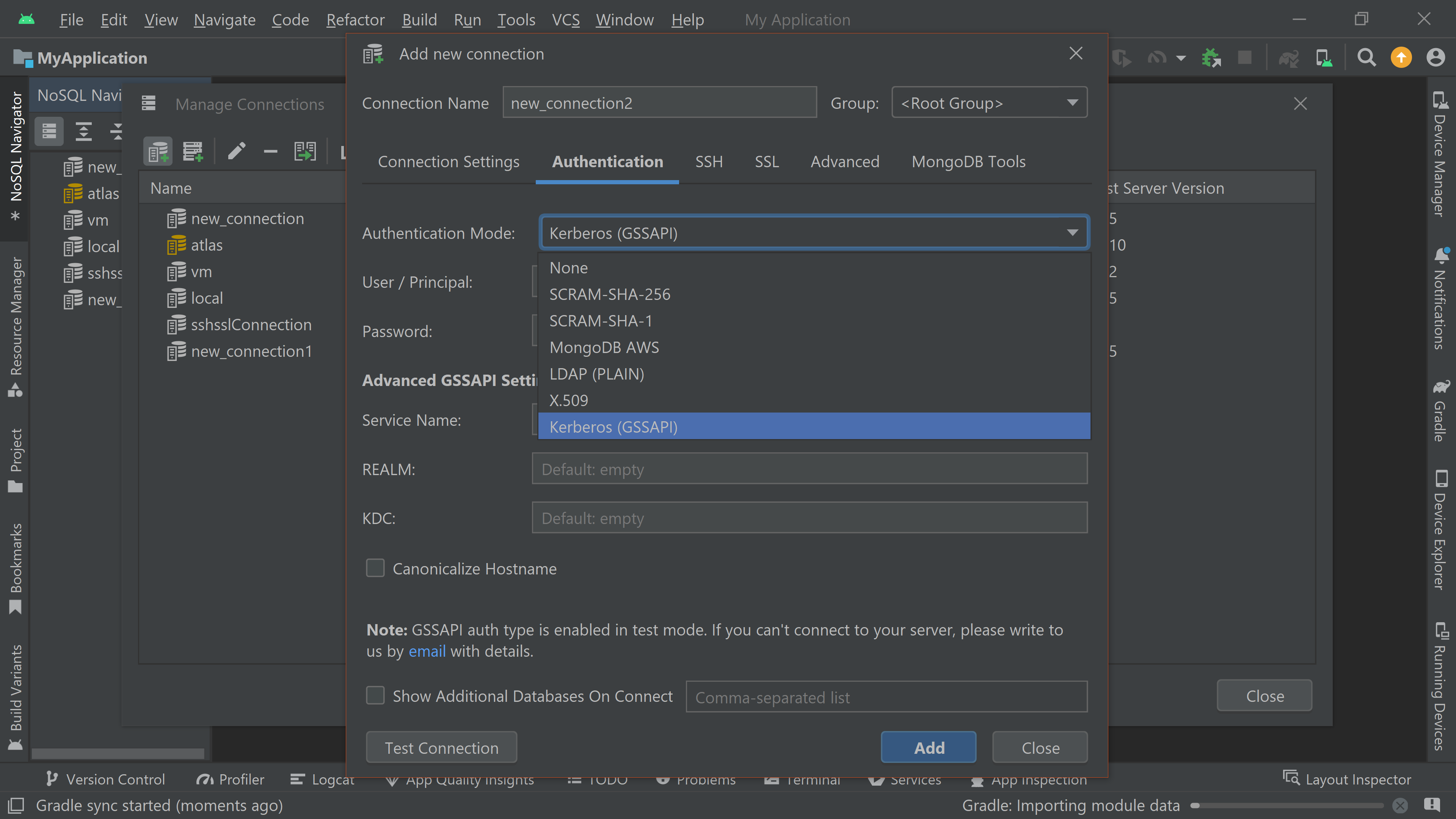 Customize any connection options in Edit Connection Dialog. Set up authorization, SSH or SSL tunnels, and advanced options.